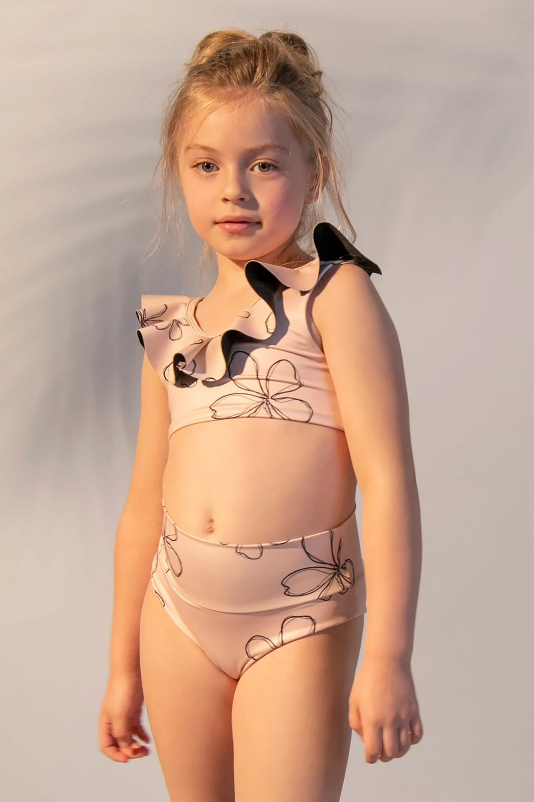 Swimwear for girls bikini two pieces, eco-friendly fabric made from recycled bottles EKO®FIBERS. Design without elastics, high waist bottom full coverage, swimsuit girl with UV protection. Model in photo is wearing size 6.