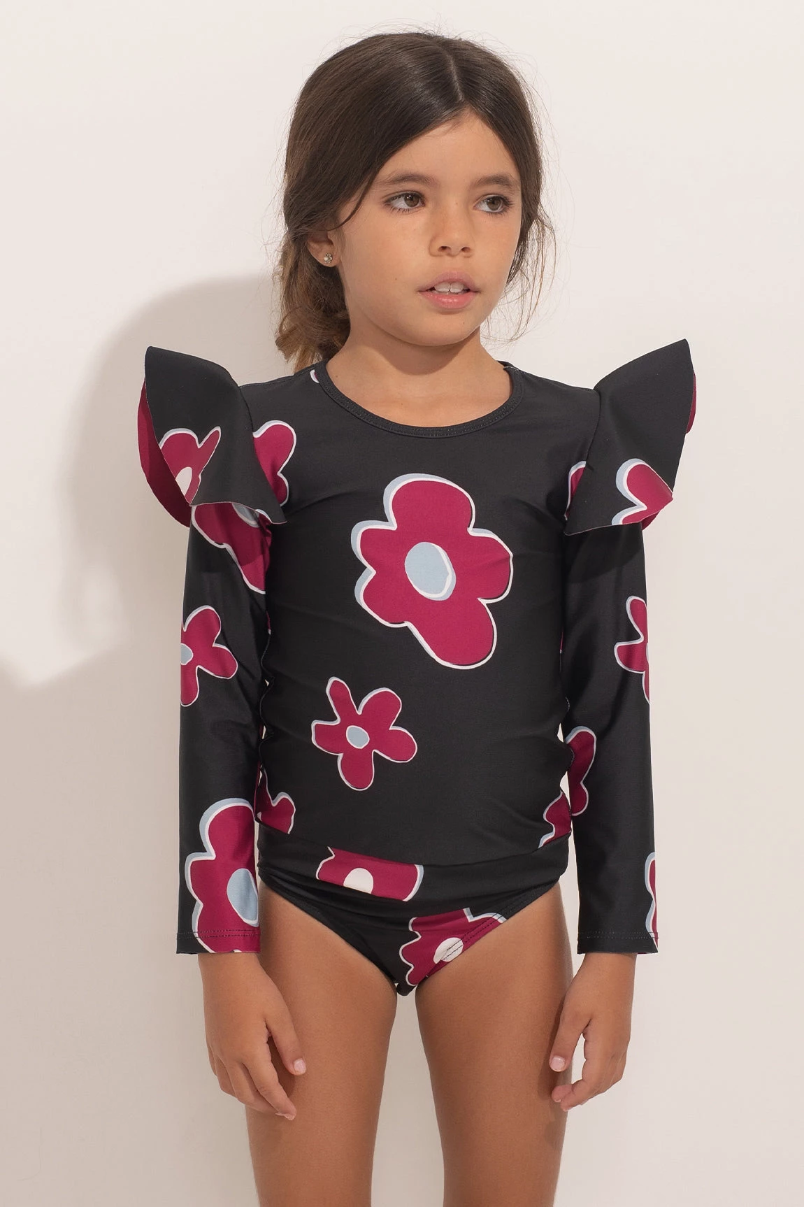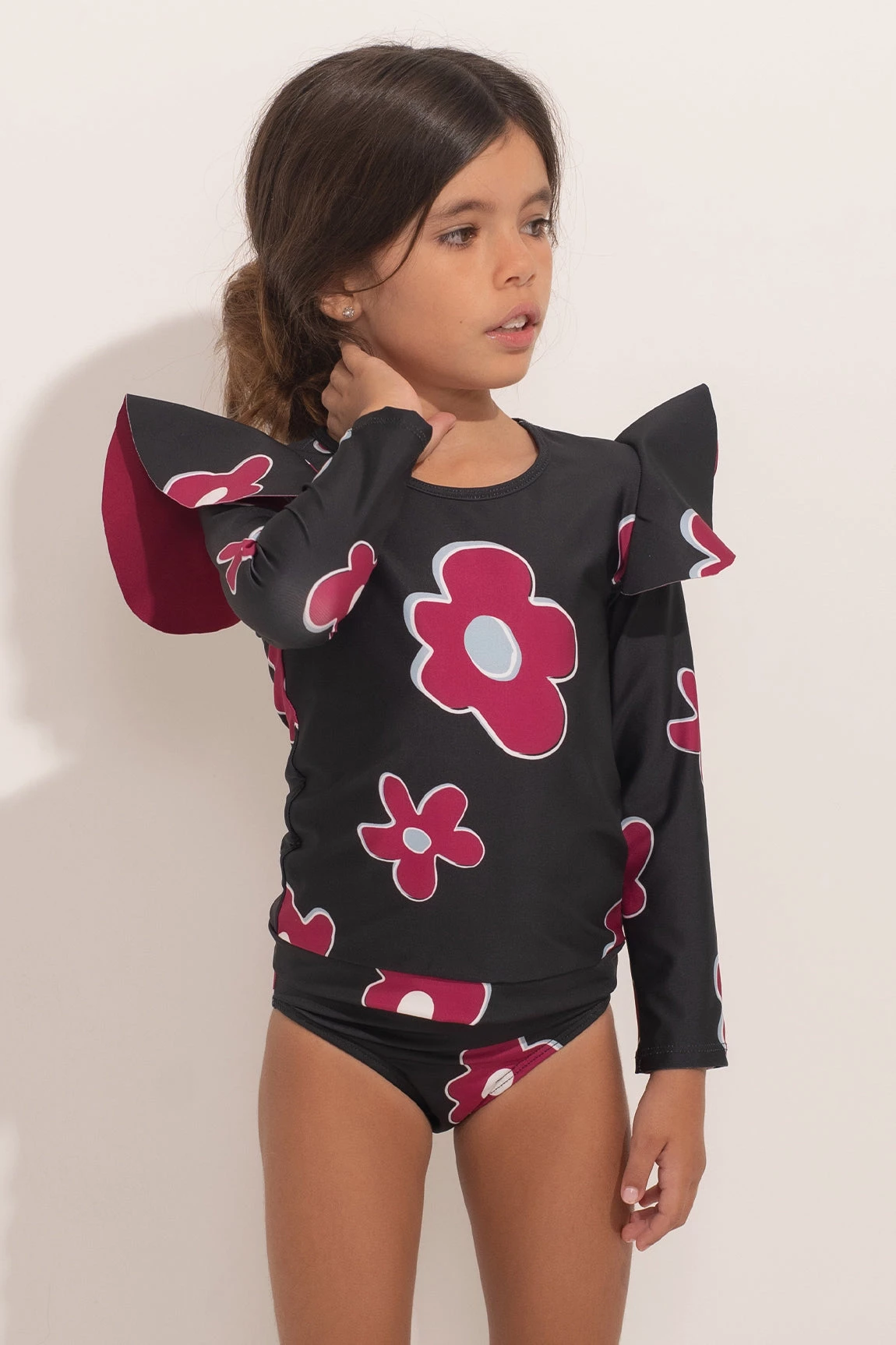Swimwear for girls bikini rash guard two pieces, eco-friendly fabric made from recycled bottles EKO®FIBERS. Design without elastics, Full coverage, Swimsuit girl with UV protection. Model in photo is wearing size 6.