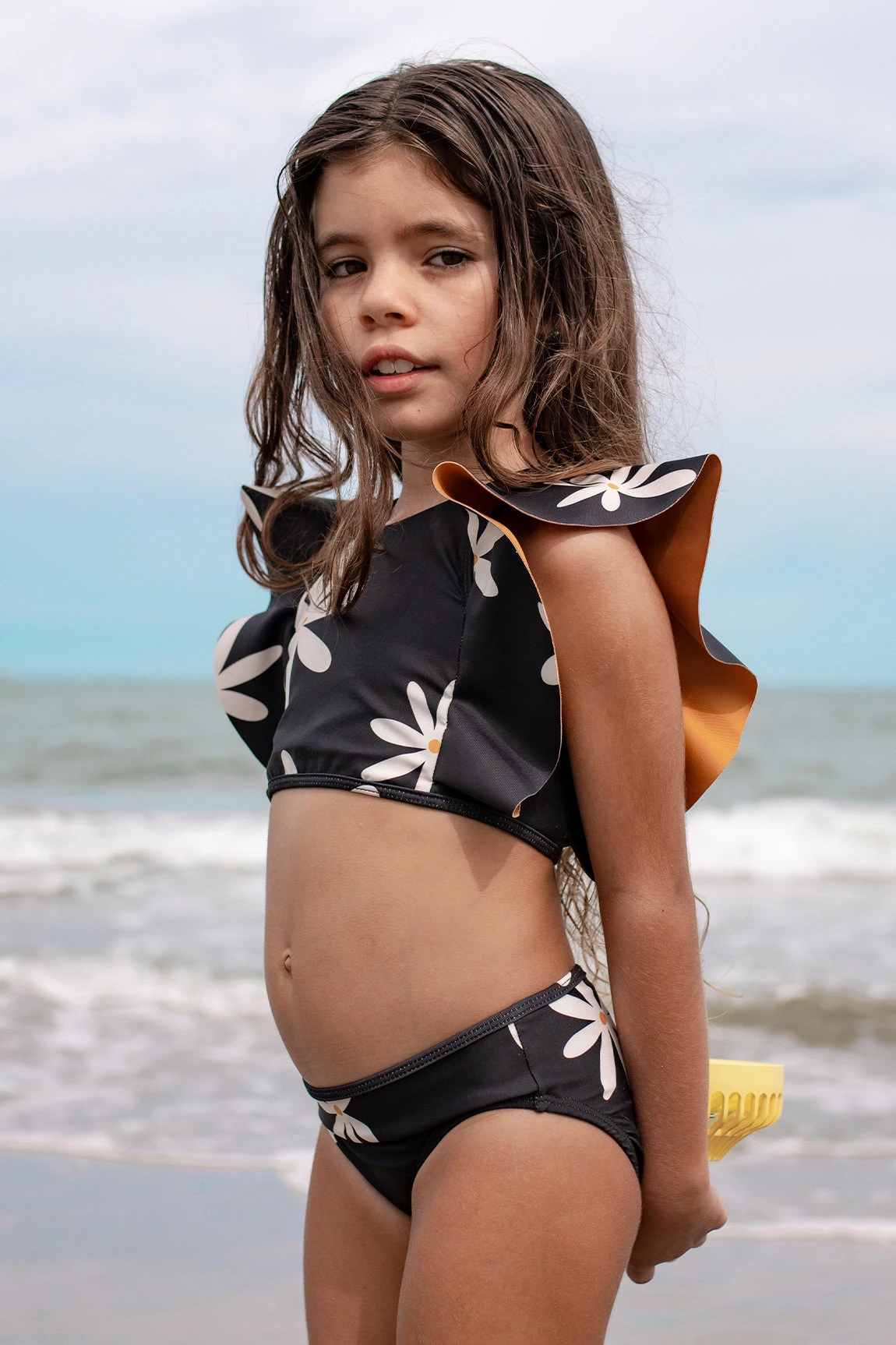 Swimwear for girls bikini two pieces, one shoulder style. Eco-friendly fabric made from recycled bottles EKO®FIBERS. Bottom design with elastics, full coverage, Swimsuit girl with UV protection. Model in photo is wearing size 6.