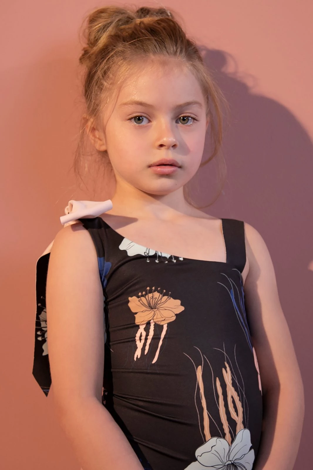 Swimwear for girls one piece, eco-friendly fabric made from recycled bottles EKO®FIBERS. Design without elastics, full coverage, adjustable strips, swimsuit girl with UV protection. Model in photo is wearing size 6.