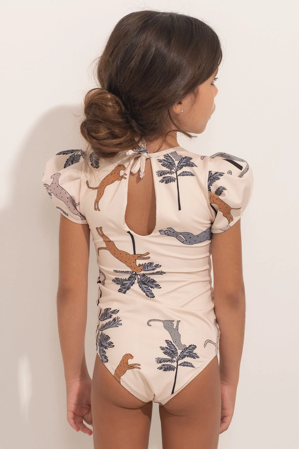 Swimwear for girls, one piece, eco-friendly fabric made from recycled bottles EKO®FIBERS. Elastics at leg opening to offer greater comfort and safety in use. Full coverage, Swimsuit girl with UV protection. Model in photo is wearing size 6.