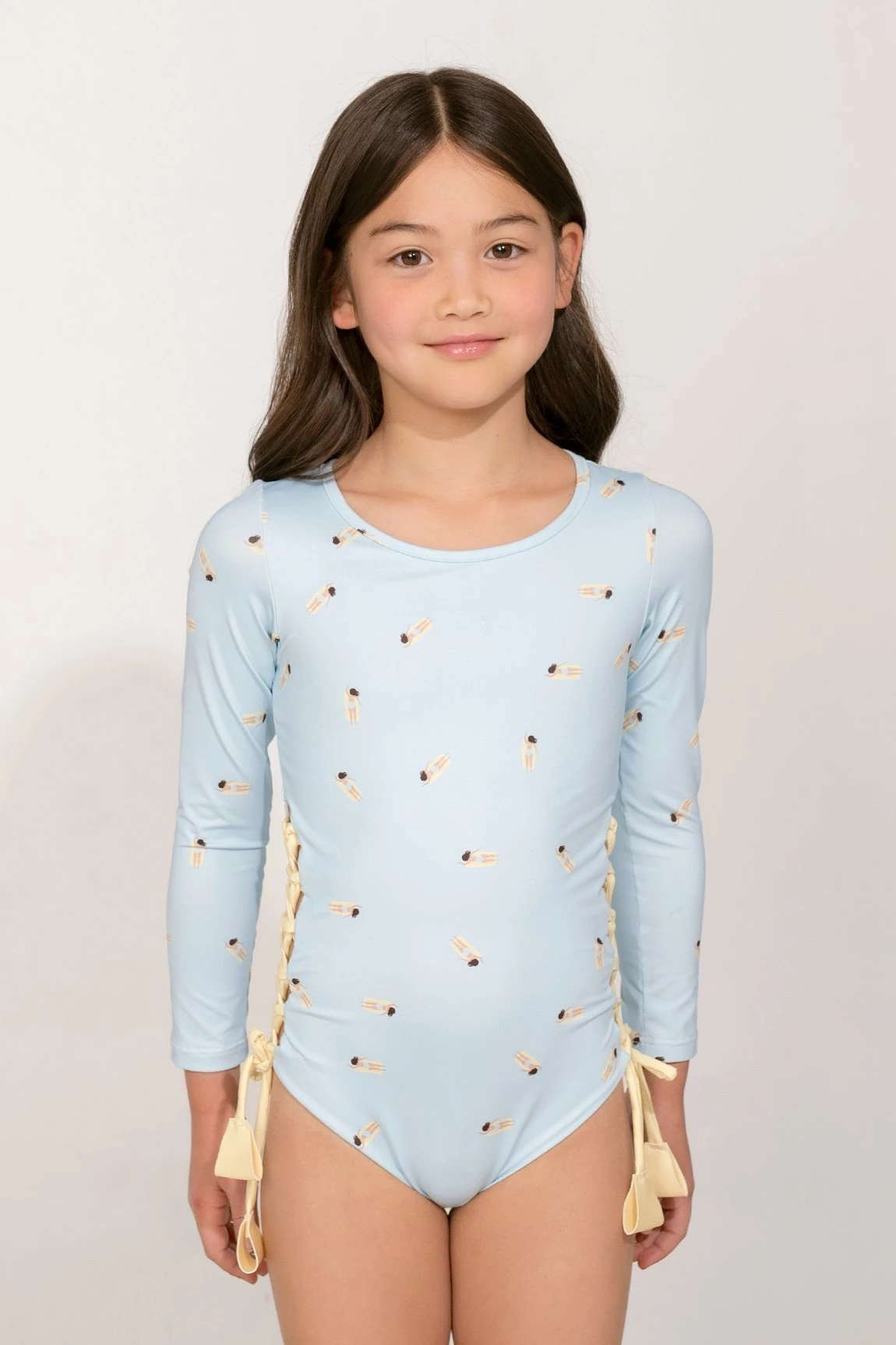 Swimwear for girls one piece blue color, eco-friendly fabric made from recycled bottles EKO®FIBERS. Design without elastics, Full coverage, Adjustable strips, Swimsuit girl with UV protection. Model in photo is wearing size 6.