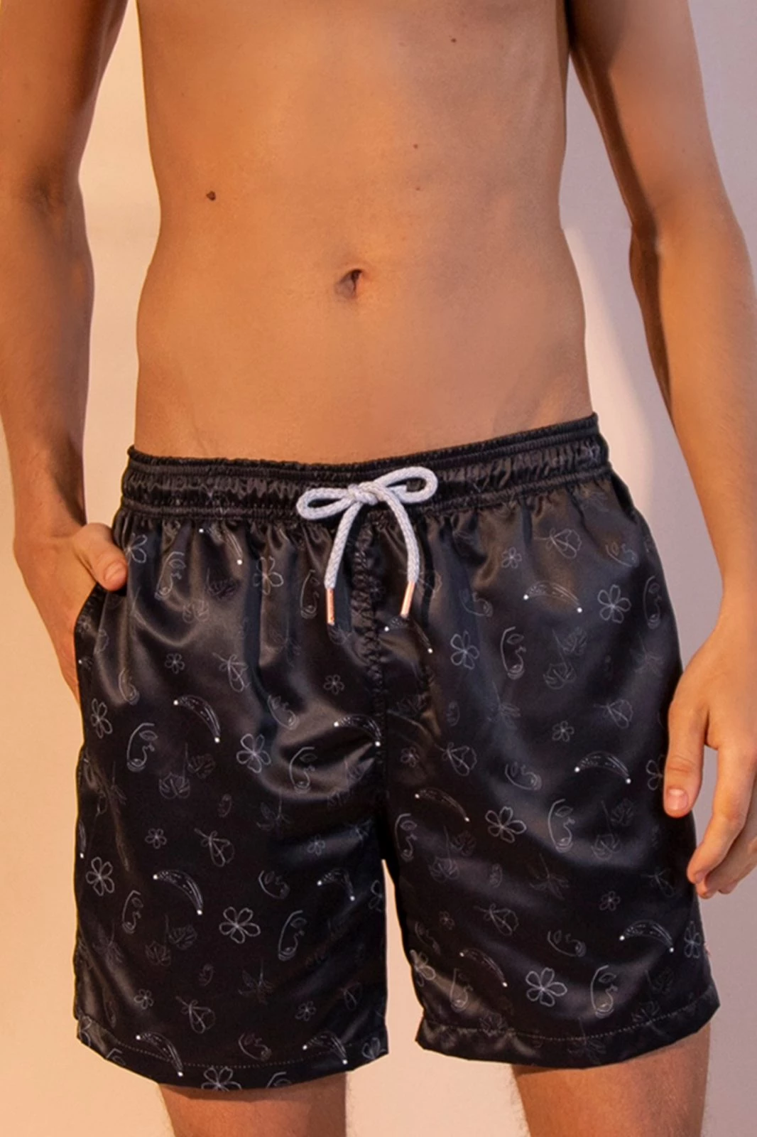 Swim short for men. Lightweight swim fabric with mesh lining, elasticated drawstring waist, stainless accessories, side functional pockets.