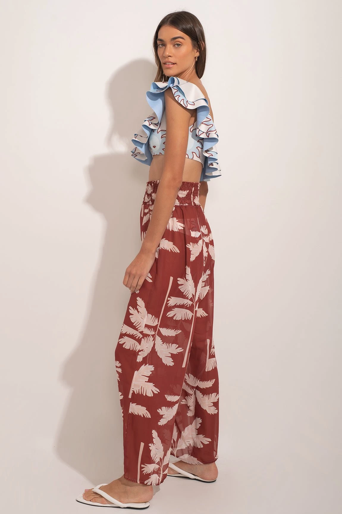 Resortwear pants. Top not included. Fast-drying product, lightweight fabric and adjustable at the waist design. Model in photo is wearing size S-M.